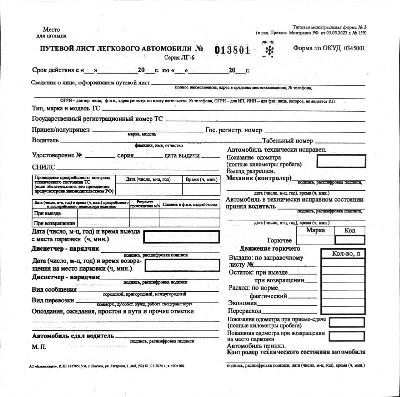 Бланк "Путевой лист легкового автомобиля с нумерацией", А5 (форма №3 от 28.09.2022) оборот., газетка, 100 экз.