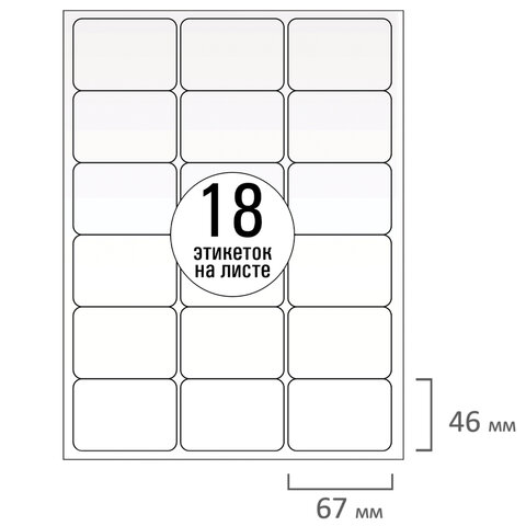 Изготовлены из матовой бумаги белого цвета плотностью 70 г/м2. Картонная упаковка содержит 50 листов формата А4, на каждом листе – восемнадцать этикеток размером 67х46 мм.