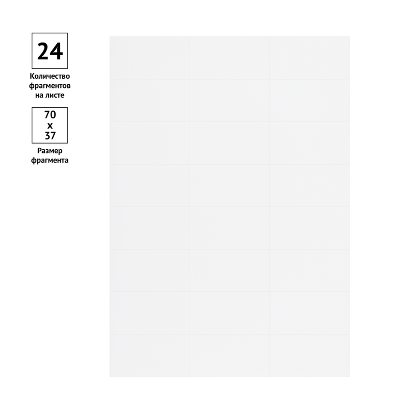 В упаковке 100 листов формата А4 плотностью 70 г/м2, количество фрагментов – 24 (70*37 мм). Этикетки самоклеящиеся OfficeSpace и лазерных принтеров, копировальных аппаратов. Перед загрузкой в оргтехнику рекомендуется пролистывать бумагу с четырех сторон.