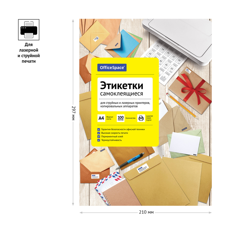 В упаковке 100 неделённых листов формата А4 плотностью 70 г/м2. Этикетки самоклеящиеся для струйных и лазерных принтеров, копировальных аппаратов. Перед загрузкой в оргтехнику рекомендуется пролистывать бумагу с четырех сторон.