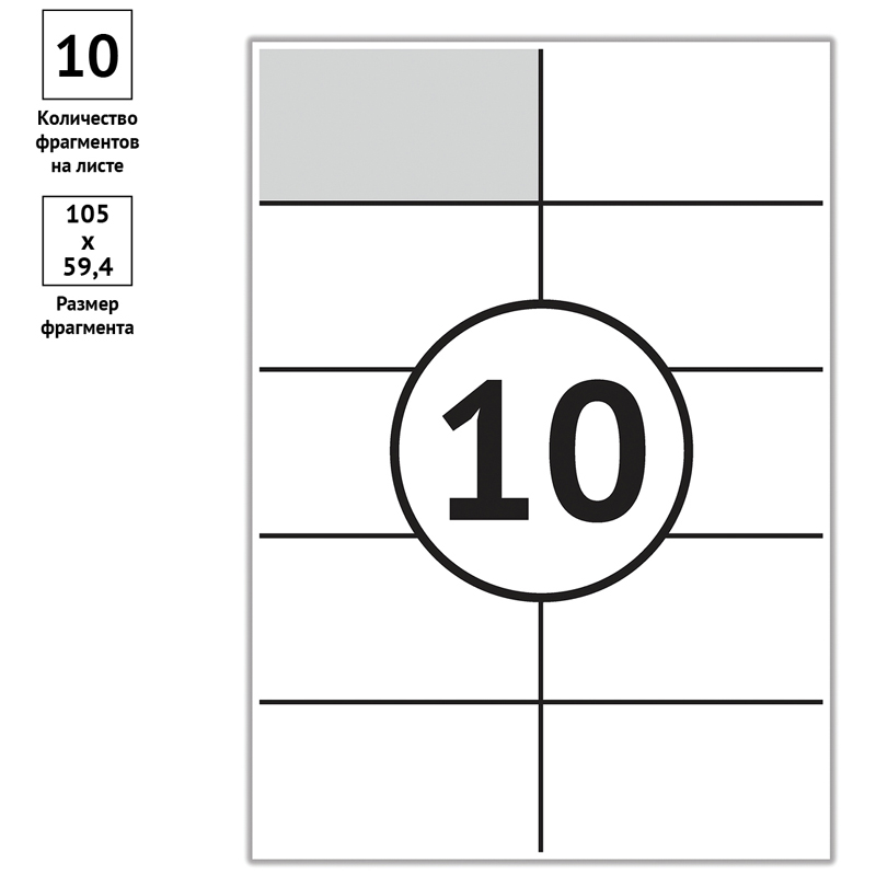 В упаковке 50 листов формата А4 плотностью 70 г/м2, количество фрагментов – 10 (105*59,4 мм). Этикетки самоклеящиеся для струйных и лазерных принтеров, копировальных аппаратов. Перед загрузкой в оргтехнику рекомендуется пролистывать бумагу с четырех сторон.