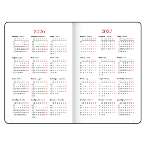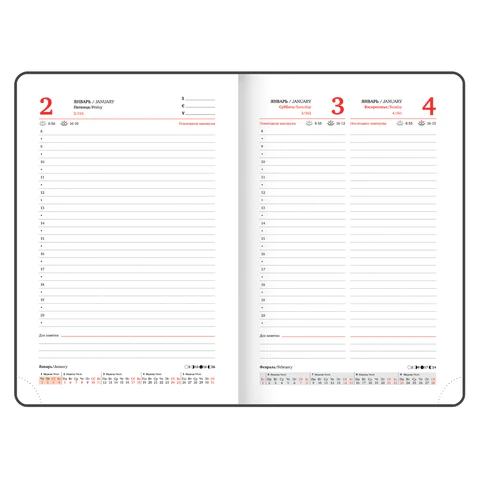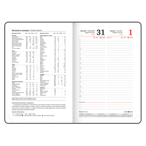 Датированный ежедневник имеет обложку из искусственной кожи. Внутренний блок включает 168 листов белой бумаги плотностью 70 г/м2. Каждая страничка имеет перфорированный угол.