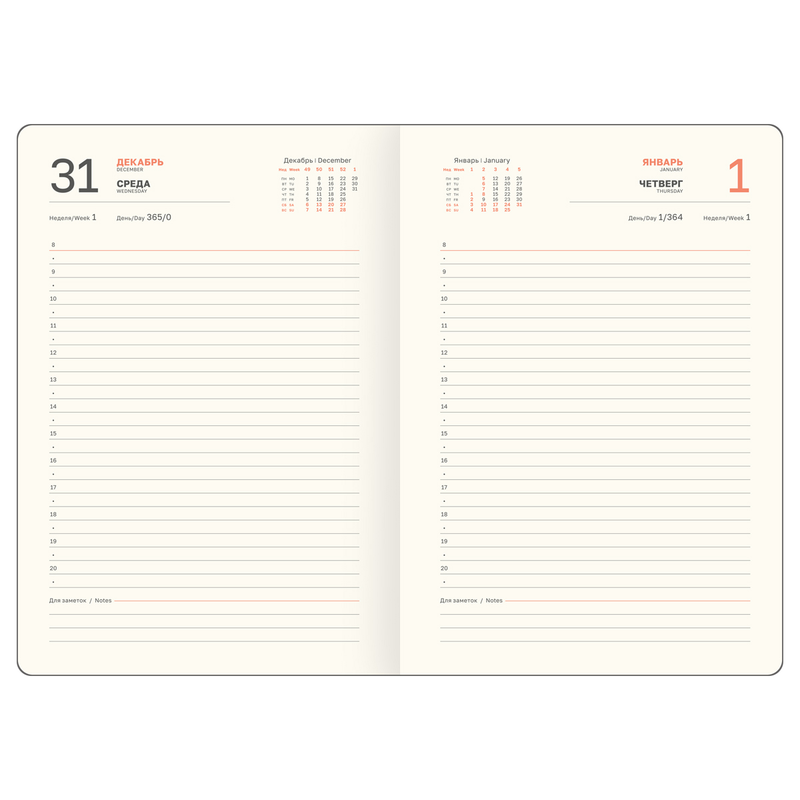 Ежедневник датированный на 2026 BG "Magnet" – надёжный спутник делового человека. Твёрдая обложка выполнена в классическом стиле из экокожи ванильного цвета с эффектом Soft touch, фиксируется магнитным клапаном. Изделие формата А5 (145*205 мм) состоит из 176 листов тонированной бумаги плотностью 70 г/м2, которая подходит для любых типов ручек и не будет просвечиваться. Перфорированные уголки и закладка-ляссе обеспечат комфорт и удобство при использовании. В ежедневнике предусмотрена справочная информация, ежемесячный планер, календарь и другие полезные сведения.