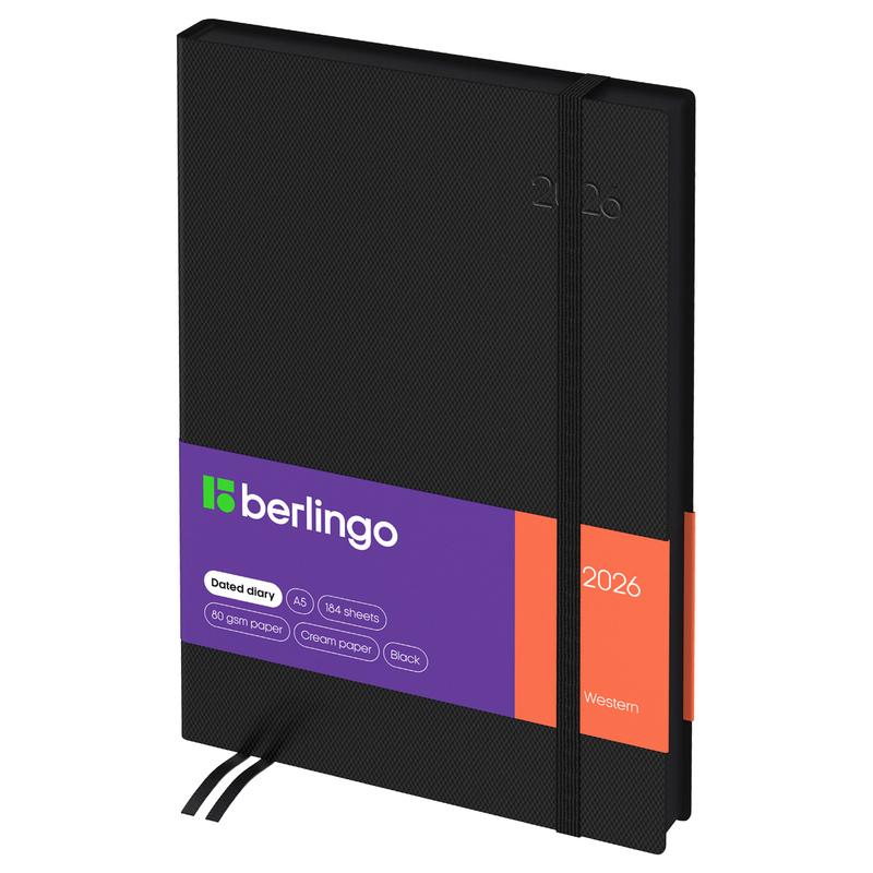 Ежедневник датированный 2026г., А5, 184л., кожзам, Berlingo "Western", черный, с резинкой