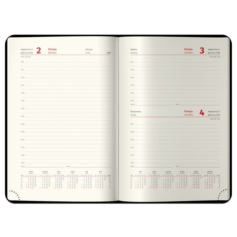 Внутренний блок состоит из 184 листов кремовой бумаги повышенной плотности 80 г/м? с пантонной печатью в 2 краски. Срез в цвет обложки.