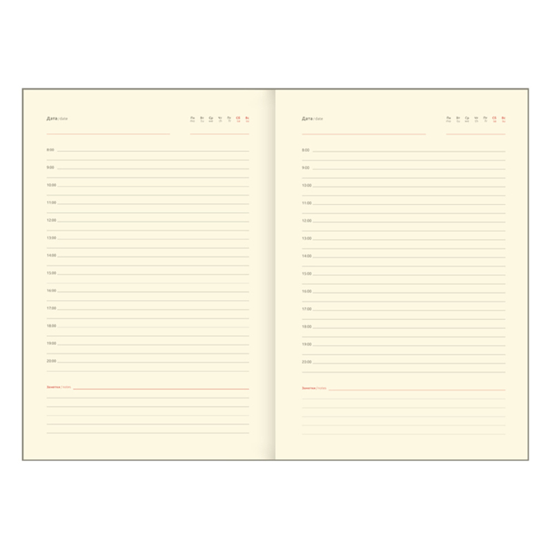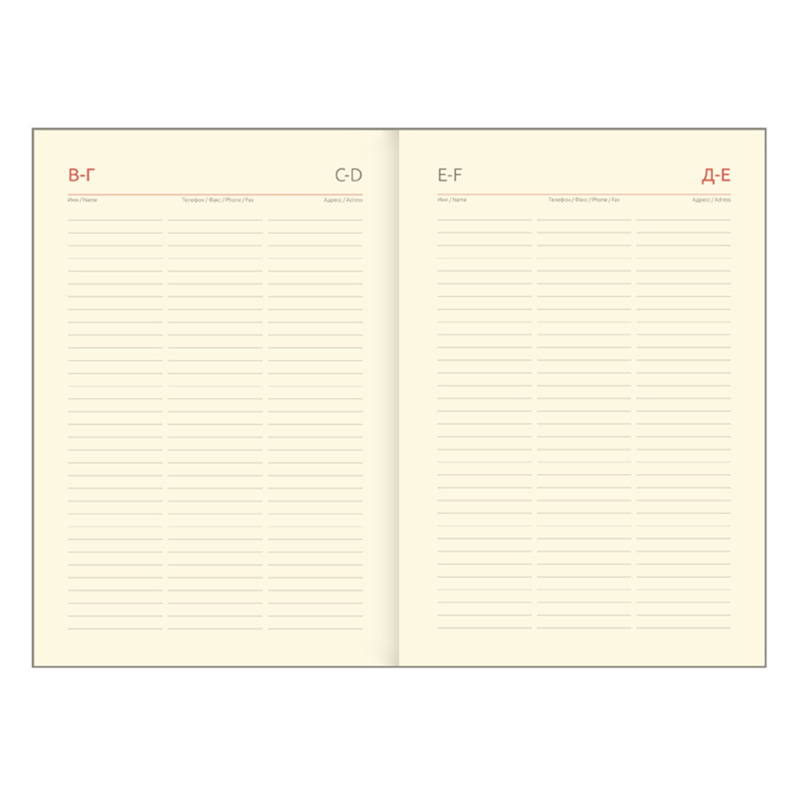 Внутренний блок ежедневника формата A5 вмещает 136 листов, которые созданы из кремовой бумаги повышенной плотности 80 г/м?, а мягкая двухслойная обложка сделана из из экокожи. Ежедневник содержит справочный материал и имеет стильную закладку-ляссе.