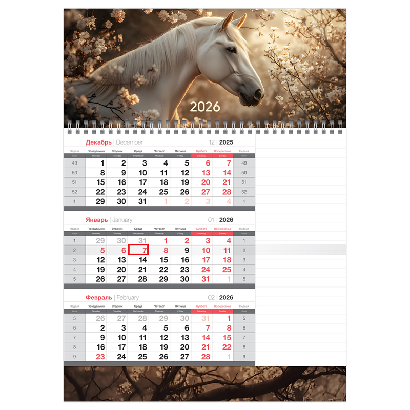 Календарь квартальный 1 бл. на 1 гр., 295*410 мм BG Mono "Лошадь", с бегунком, блок для заметок, 2026г