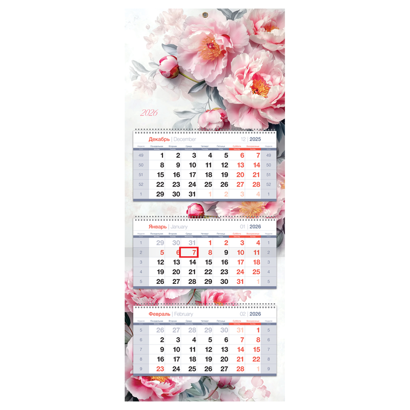 Календарь квартальный 3 бл. на 3 гр., 330*810 мм BG Premium "Пионы", с бегунком, 2026г.