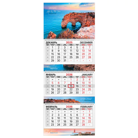 Календарь квартальный на 2026 г., 3 блока, 3 гребня, бегунок, мелованная бумага, BRAUBERG EXTRA, "Южный берег"