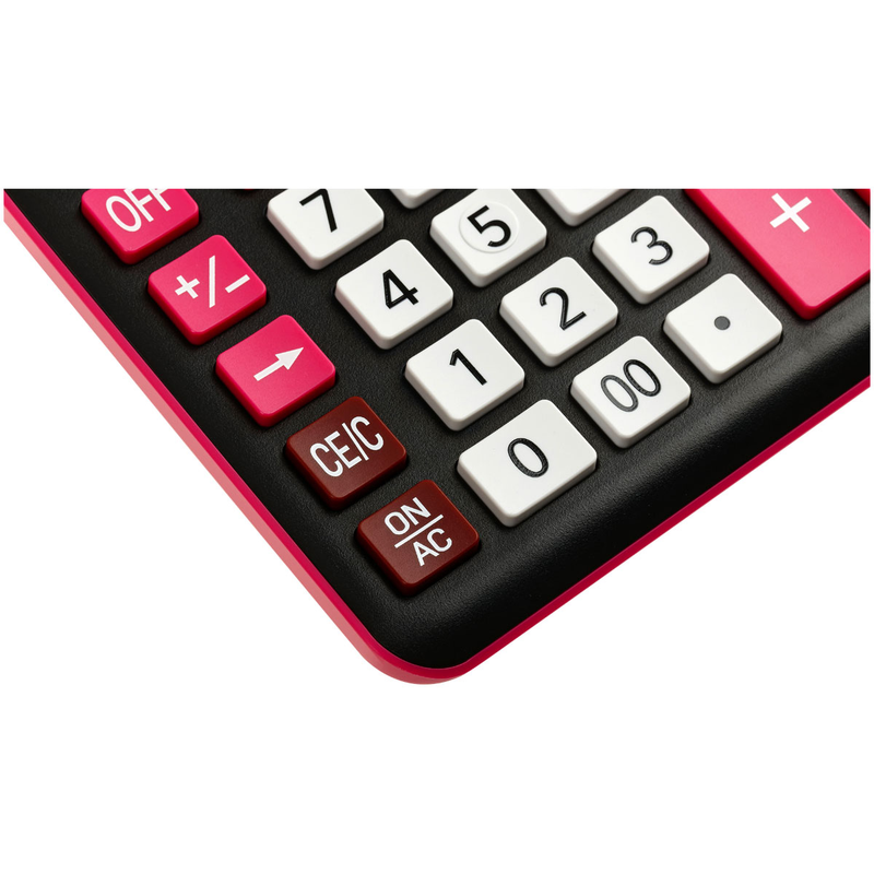 Размер калькулятора – 155*206*38 мм, цвет – черный/красный. Оптимальный набор функций поможет автоматизировать расчёты: коррекция последнего введенного значения, расчёт наценки, кнопка «00», двойная память. Двойное питание (солнечная батарея + батарея LR44) и автоматическое отключение увеличивают срок службы.
