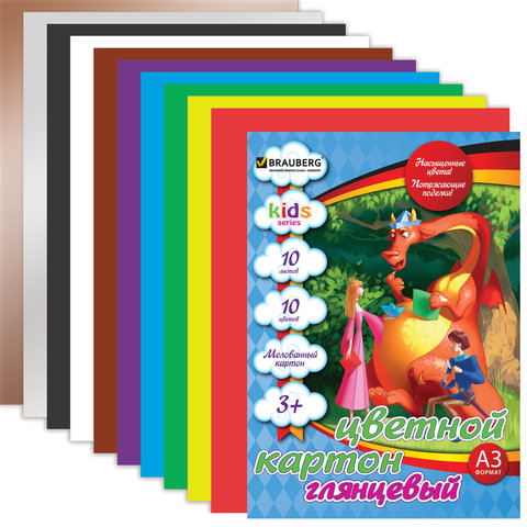 Картон цветной А3 мелованный (глянцевый), 10 листов 10 цветов, в папке, BRAUBERG, 297х420 мм, "Дракон"