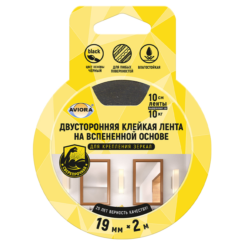 Клейкая лента двусторонняя Aviora, 19мм*2м, на вспененной основе, сверхпрочная