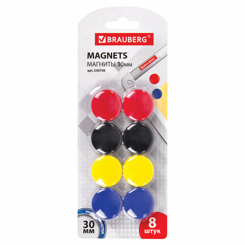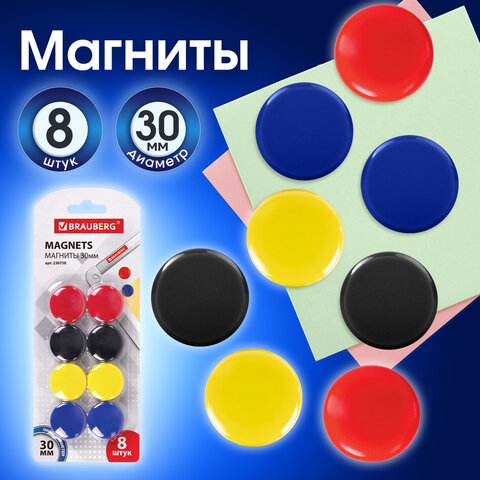 Магниты диаметром 30 мм, КОМПЛЕКТ 8 штук, цвет АССОРТИ, в блистере, BRAUBERG