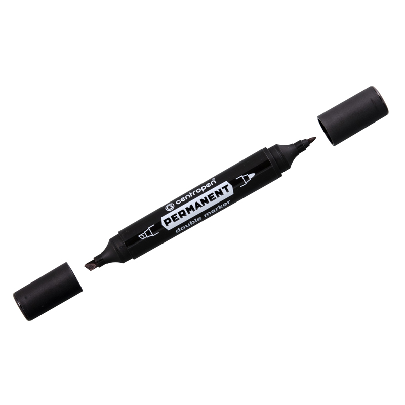 Перманентный маркер двухсторонний, черный. Предназначен для письма на большинстве поверхностей. Устойчивый к воде, стиранию, атмосферным воздействиям. Пулевидный и клиновидный наконечник, толщина линии 1/1-4 мм.