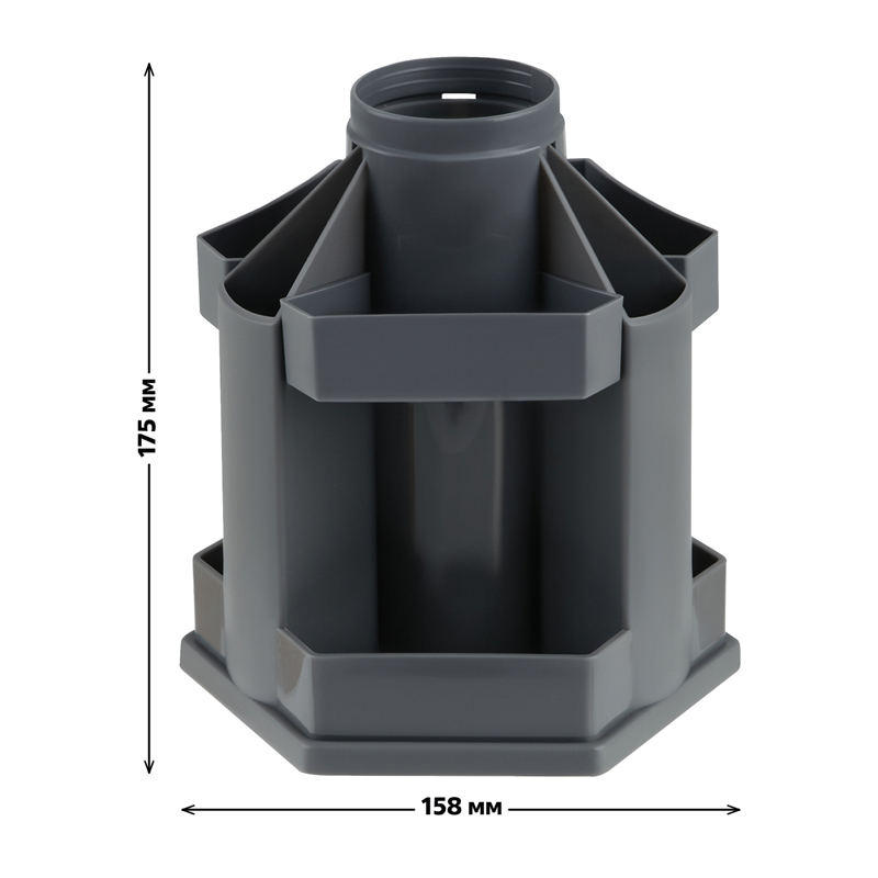 Настольная подставка "СТАММ" серии "Maxi Desk" предназначена для хранения канцелярских принадлежностей. Вместительная и устойчивая подставка имеет 10 отделений разной высоты и формы. Изделие высотой 17,5 см и основанием 13,5*15,5 см изготовлено из качественного пластика. Свободно вращается на 360 градусов. Поставляется без наполнения. Цвет изделия - серый.