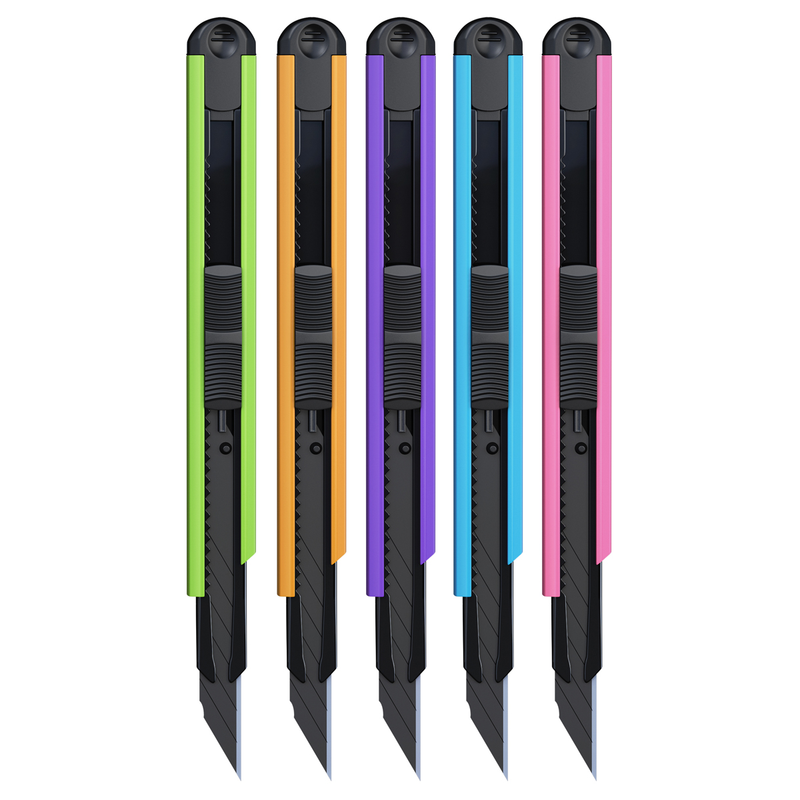Нож канцелярский с автоматической системой фиксации лезвия auto-lock. Корпус ножа полностью металлический. Комплектуется износостойким стальным лезвием с углом 30 градусов черного цвета, для более легкого скольжения. Ширина лезвия - 9 мм.