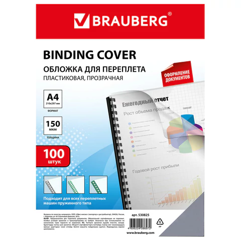 Обложка А4 BRAUBERG 150мкм, прозрачный пластик, 100л.