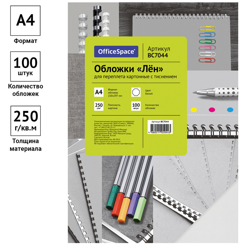 Обложка А4 OfficeSpace "Лен" 250г/кв.м, белый картон, 100л.