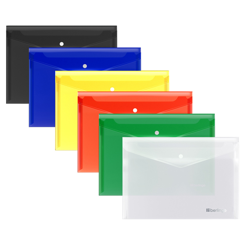 Прозрачные конверты в упаковке представлены в ассорти цветов: бесцветного, зелёного, жёлтого, синего, чёрного и красного. Папка вмещает до 100 листов.