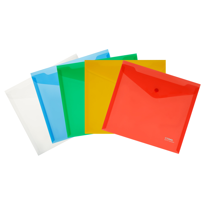Папка-конверт на кнопке СТАММ А5+ (240*215 мм), 180мкм, пластик, прозрачная, ассорти