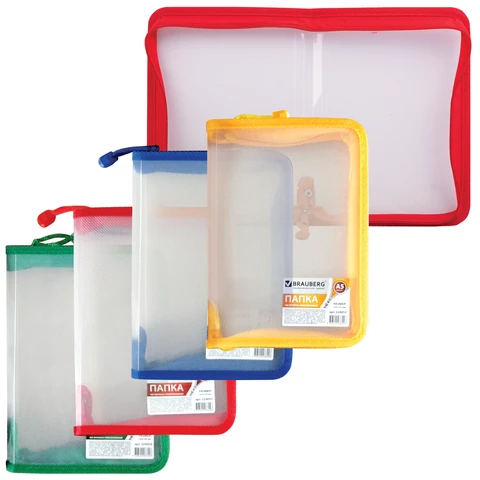 Папка на молнии BRAUBERG, А5 (235х165 мм), 500мкм, прозрачная, ассорти