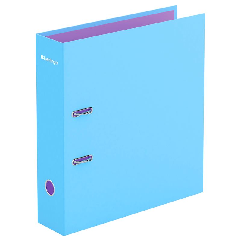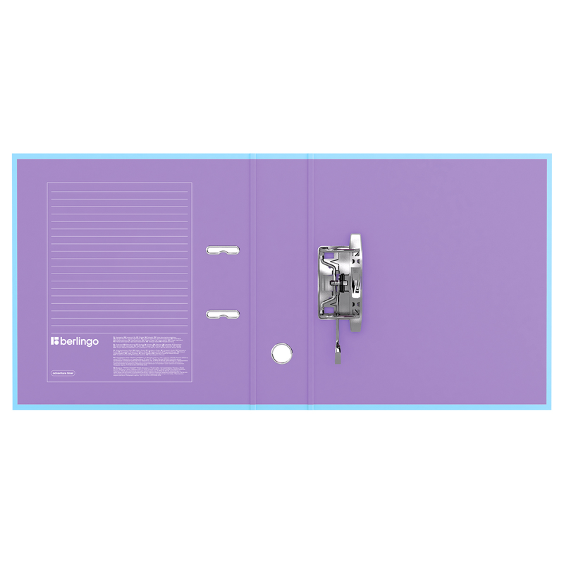 Папка вмещает до 600 листов. Ширина корешка составляет 80 мм. Выполнена в стильных пастельных цветах: голубая внешняя сторона и сиреневая внутренняя. Изготовлена из жёсткого износостойкого картона с покрытием из матовой ламинированной бумаги.