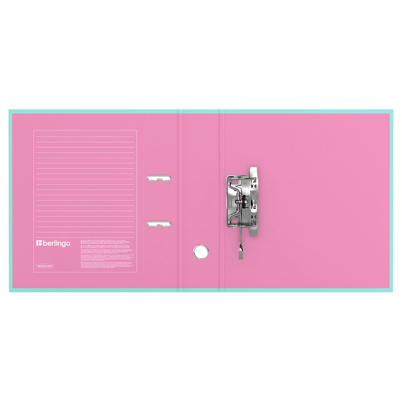 Папка вмещает до 600 листов. Ширина корешка составляет 80 мм. Выполнена в стильных пастельных цветах: мятная внешняя сторона и розовая внутренняя. Изготовлена из жёсткого износостойкого картона с покрытием из матовой ламинированной бумаги.