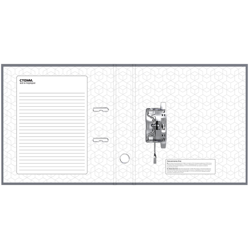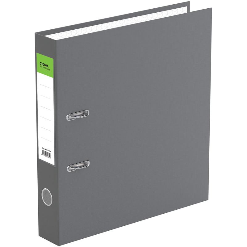 Папка–регистратор «СТАММ» серии «Стандарт» размером А4 (320*290*50 мм) с обложкой из жесткого износостойкого картона с односторонним покрытием из бумвинила. Вместимость папки – 450 листов, ширина корешка – 50 мм.