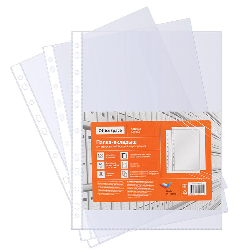 Папка-вкладыш с перфорацией (файлы) OfficeSpace А4, КОМПЛЕКТ 100 шт., 35мкм, глянцевая