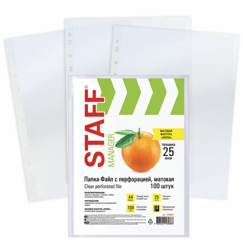 Папка-вкладыш с перфорацией (файлы) STAFF А4,КОМПЛЕКТ 100 шт., 25мкм, матовая