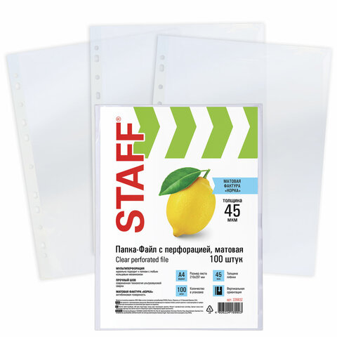 Папки-файлы перфорированные, А4, STAFF, КОМПЛЕКТ 100 шт., матовые, 45 мкм