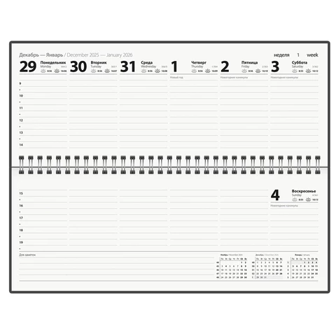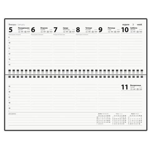 Внутренний блок содержит 64 листа офсетной бумаги белого цвета плотностью 65 г/м2. Обложка из мелованного картона. Размер планинга – 285х112 мм.