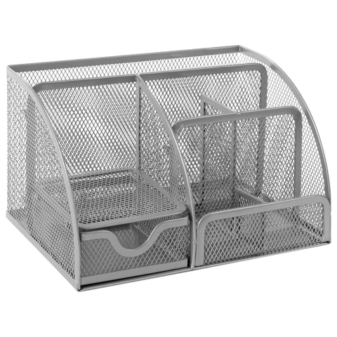 Изготовлена из металлической сетки. Имеет размеры 125х220х140 мм. Выполнена в серебристом цвете. Состоит из 7 секций, которые позволяют хранить и сортировать самые разные канцелярские принадлежности: от блоков для записей и кнопок – до ручек и карандашей. Мягкие подушечки на дне предотвращают скольжение и порчу мебели. Поставляется без канцелярского наполнения.