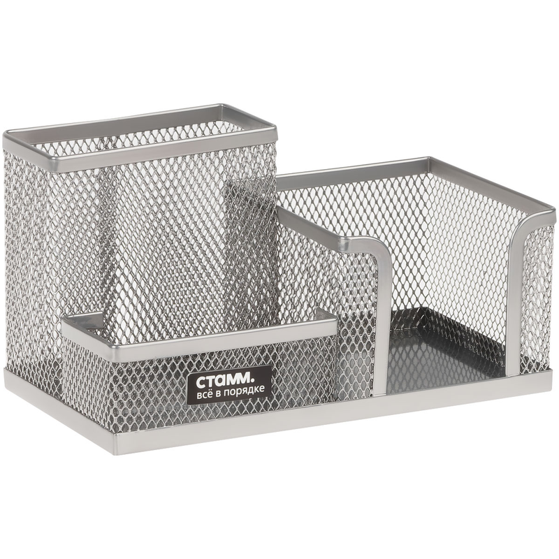 Изготовлена из металлической сетки. Имеет размеры 102х186х95 мм. Состоит из 3 отделений: одного для бумажного блока размером 90х90 мм и двух – для пишущих принадлежностей и канцелярских мелочей. Мягкие подушечки на дне предотвращают скольжение и порчу мебели.