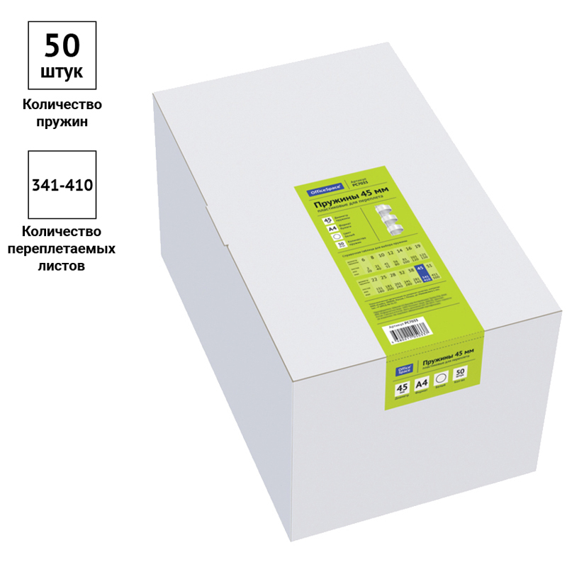 Пластиковые пружины белого цвета диаметром 45мм предназначены для переплета документов. Легко выдерживают многократное раскрытие при необходимости добавить или удалить листы из готовой брошюры. Для надежной фиксации листов брошюры в пружине предусмотрены специальные блокирующие замки. Рекомендуемый объем брошюры при использовании данного диаметра пружины: 341-410 листов.
