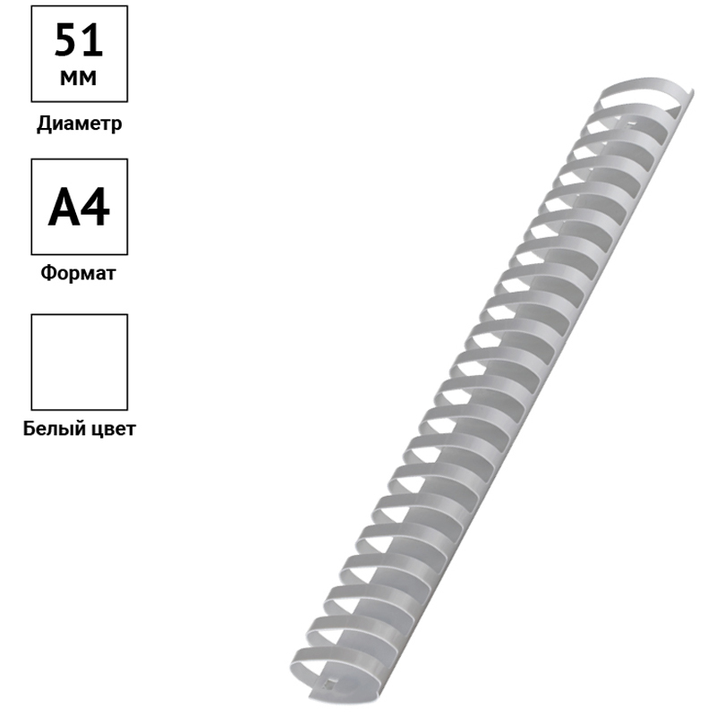 Пластиковые пружины белого цвета диаметром 51мм предназначены для переплета документов. Легко выдерживают многократное раскрытие при необходимости добавить или удалить листы из готовой брошюры. Для надежной фиксации листов брошюры в пружине предусмотрены специальные блокирующие замки. Рекомендуемый объем брошюры при использовании данного диаметра пружины: 411-500 листов.