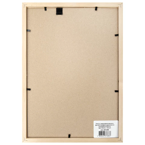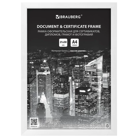 Рамка формата А4 (21х30 см) выполнена из дерева белого цвета. Имеется возможность вертикального и горизонтального подвеса. Ширина багета - 14 мм. Благодаря вставке из пластика вместо стекла, рамка является менее хрупкой.