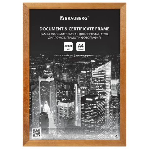 Рамка формата А4 (21х30 см) выполнена из дерева цвета "мокко". Имеется возможность вертикального и горизонтального подвеса. Ширина багета - 14 мм. Благодаря вставке из пластика вместо стекла, рамка является менее хрупкой.
