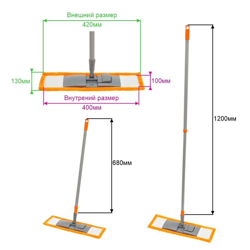 Тип швабры: плоская. Тип крепления насадки: карманы. Тип крепления рукоятки: резьба 1,6 см. Диаметр рукоятки: 2,2 см. Максимальная длина рукоятки: 120 см. Минимальная длина рукоятки: 68 см. Размер флаундера: 39 х 9 см. Размер насадки внешний: 42 х 13 см. Размер насадки внутренний: 40 х 10 см. Подвижное соединение ручки и держателя: да. Материал насадки: микрофибра. Материал рукоятки: металл. Материал держателя: пластик. Сменные насадки: 603116