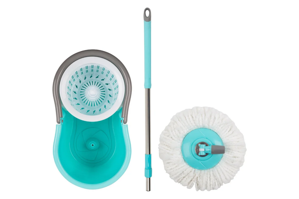 Ведро с возможностью отжима обеспечит комфортную работу: в комплект входит насадка из микрофибры (диаметр 35?см, вес 100?г, 1?шт.) и пластиковая центрифуга для отжима; объём ведра — 10?л, длина швабры регулируется в диапазоне 83–110?см, трубка имеет диаметр 25?мм (толщина нержавеющей стали — 0,3?мм), ручка разборная.