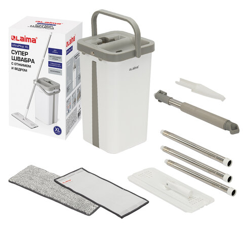 Швабра с отжимом и ведром 12л/9л двухкамерное, 2 насадки микрофибра, карманы с 2-х сторон, рукоятка 134-154см белый NeoMop XL, LAIMA