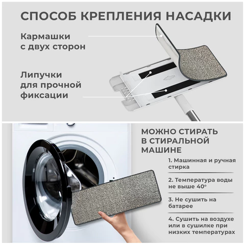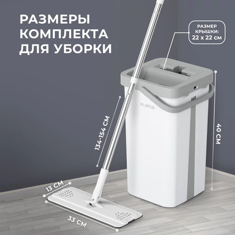 Комплект состоит из двухкамерного ведра с вертикальным отжимом, швабры с телескопической ручкой, 2 насадок МОП (с кармашками и липучками) из 100% микрофибры и скребка для ее очистки. Размеры ведра с крышкой – 40 х 22 х 22 см. Размеры основания швабры: длина – 33 см, ширина – 13 см. Материалы – пластиковые части из полипропилена, рукоятка из нержавеющей стали. Размеры насадки из микрофибры: длина – 33 см, ширина – 12,5 см. Способ крепления – кармашки с двух сторон и липучки. Длина рукоятки (вторая цифра с учетом раздвижной части) – от 134 до 154 см. Общая высота швабры (вторая цифра с учетом раздвижной части) – от 136 до 156 см.