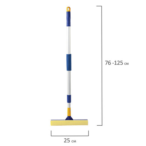 Выполняет две функции: мытье стеклянной поверхности с помощью спонжа и сгон воды резиновым лезвием. Телескопическая ручка упрощает уборку. Ручка выполнена из алюминия. Длина телескопической ручки - 76-125 см. Ширина рабочей части - 25 см.
