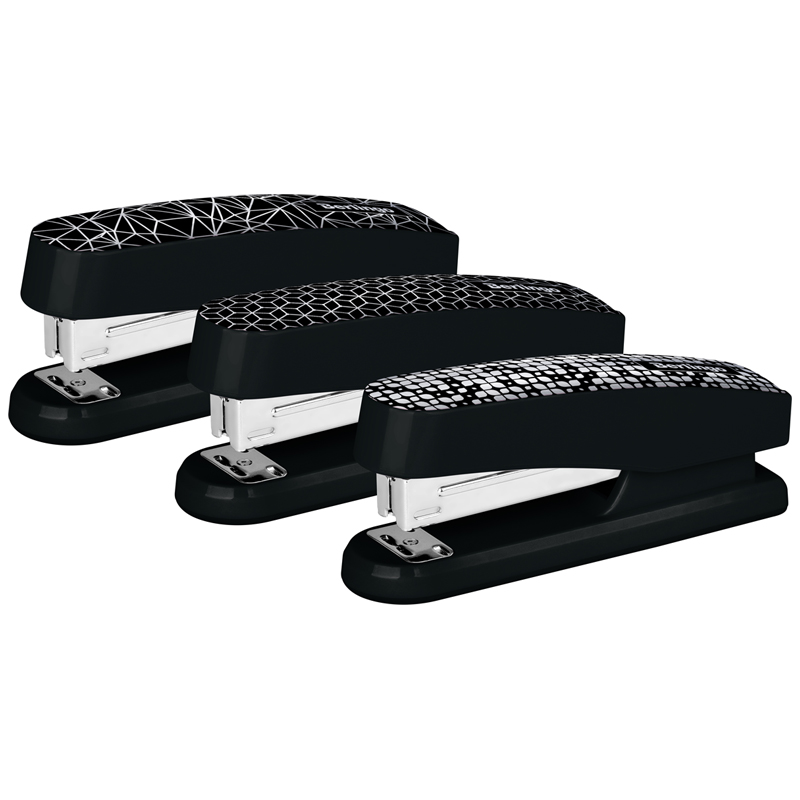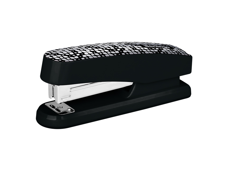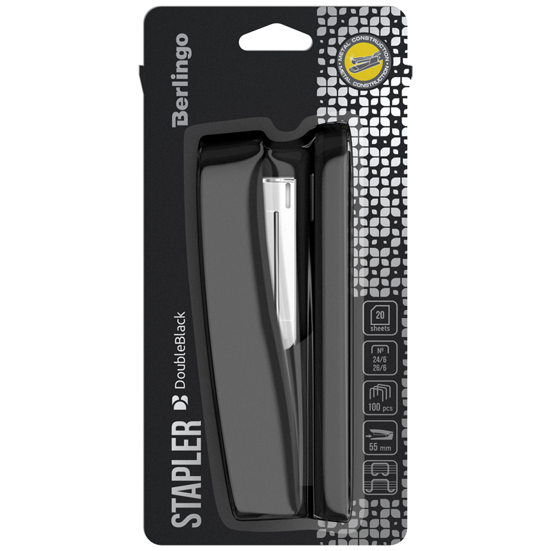 Стильный канцелярский степлер Berlingo DoubleBlack отлично подходит для ежедневного использования на рабочем месте. Степлер вмещает 100 скоб размером №24/6, 26/6, имеет 2 типа скрепления. Сшивает до 20 листов. Степлер отличается от других моделей необычным дизайном с рисунком, напечатанным на верхней крышке корпуса. У данной модели пластиковый корпус и полностью металлический механизм. Корпус выполнен в чёрном цвете с необычным рисунком.