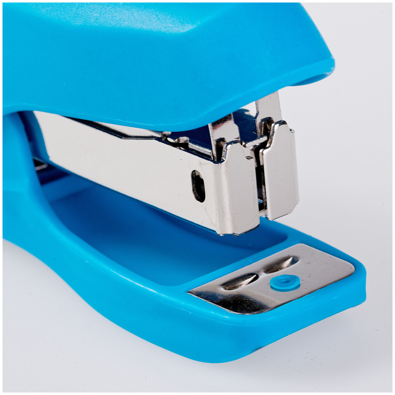 Пластиковый степлер для скоб №24, сшивает до 20 листов, вмещает 50 скоб. Пластиковый корпус, металлический механизм, цвет корпуса - синий.