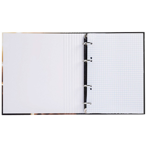 Тетрадь А5 формата 120 листов. Обложка: твердая. Внутренний блок: офсет, клетка. Скрепление: на 4-х кольцах.