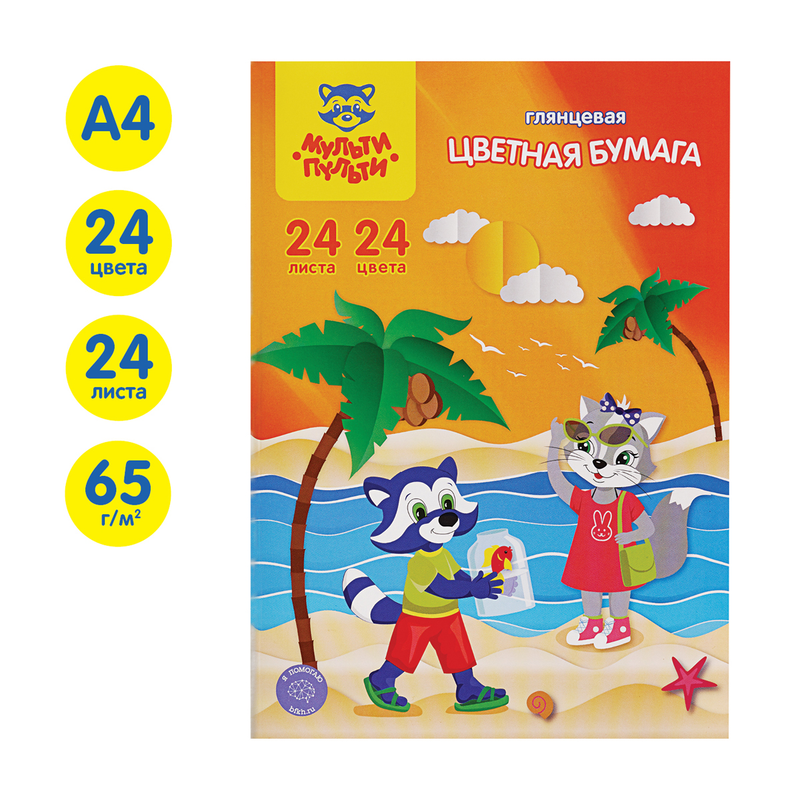 В наборе представлено 24 ярких цветов односторонней мелованной бумаги на 24 листах.