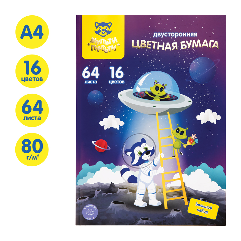Цветная бумага мелованная А4, Мульти-Пульти, двустор., 64л., 16цв., на склейке, "Енот в космосе"