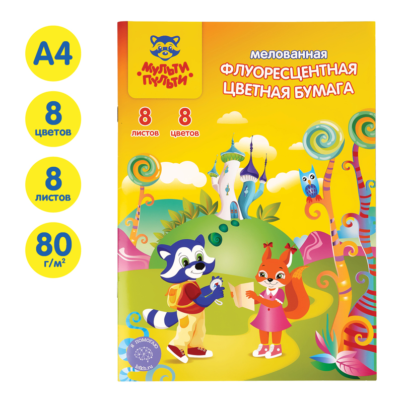Цветная бумага мелованная-флуоресцентная А4, Мульти-Пульти, 8л., 8цв., на скобе, "Енот в волшебном мире"